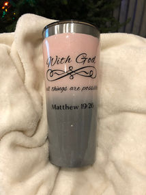 ![]() 22oz. curved tumbler, sprayed spotted paint basecoat with custom vinyl lettering | ![]() 22oz. curved tumbler, sprayed spotted paint basecoat with custom vinyl lettering | ![]() 24oz. straight tumbler, solid glitter color basecoat with custom vinyl graphics |